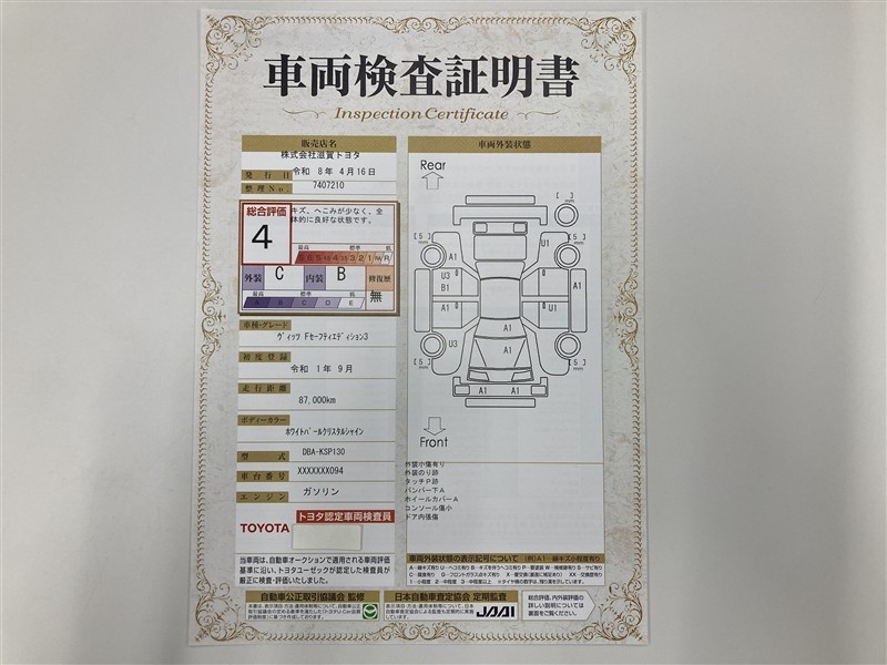 上記と同様の評価点・状態表を「車両検査証明書」として店舗の展示車両に搭載しております。