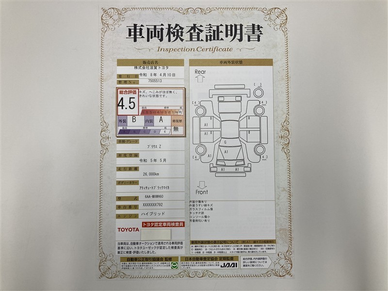 上記と同様の評価点・状態表を「車両検査証明書」として店舗の展示車両に搭載しております。