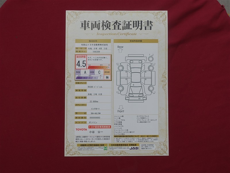 詳細及び現状の車両状態につきましては、店舗スタッフまでお尋ねください。 - 注2)上記と同様の評価点・状態表を「車両検査証明書」として店舗の展示車両に搭載しております。