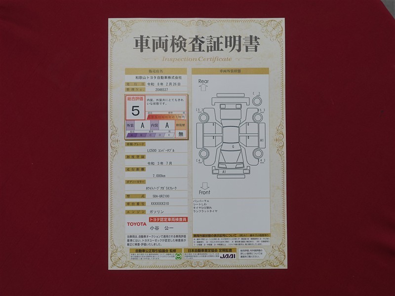詳細及び現状の車両状態につきましては、店舗スタッフまでお尋ねください。 - 注2)上記と同様の評価点・状態表を「車両検査証明書」として店舗の展示車両に搭載しております。
