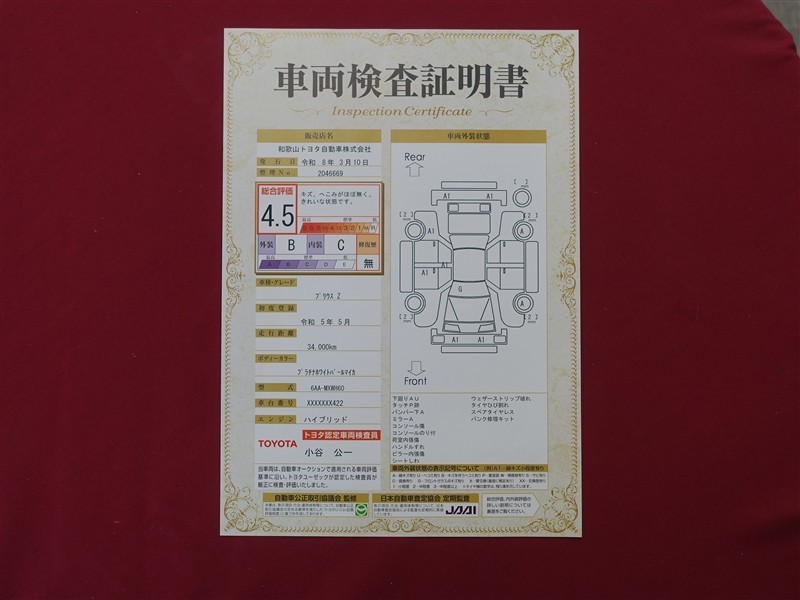 詳細及び現状の車両状態につきましては、店舗スタッフまでお尋ねください。 - 注2)上記と同様の評価点・状態表を「車両検査証明書」として店舗の展示車両に搭載しております。