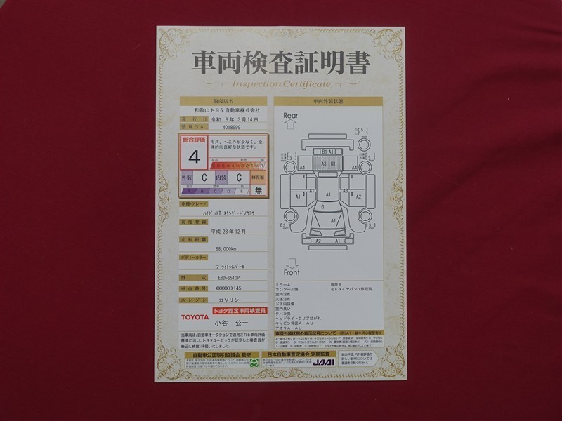 詳細及び現状の車両状態につきましては、店舗スタッフまでお尋ねください。 - 注2)上記と同様の評価点・状態表を「車両検査証明書」として店舗の展示車両に搭載しております。
