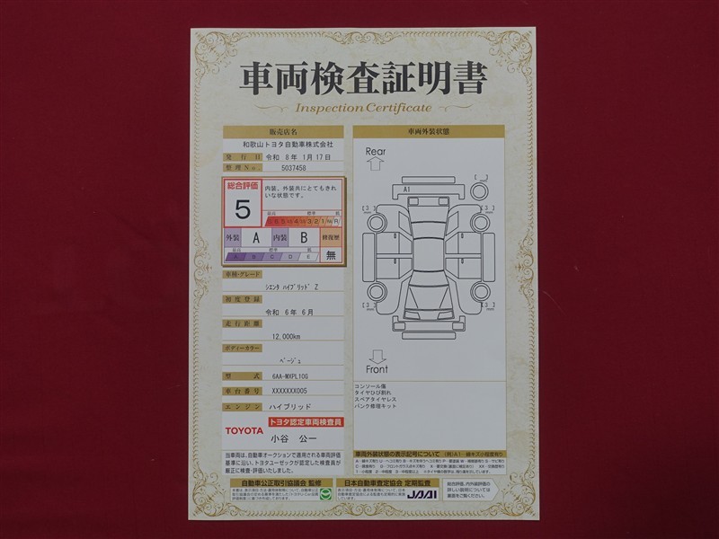 詳細及び現状の車両状態につきましては、店舗スタッフまでお尋ねください。 - 注2)上記と同様の評価点・状態表を「車両検査証明書」として店舗の展示車両に搭載しております。