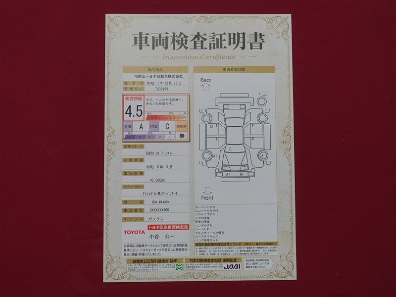 詳細及び現状の車両状態につきましては、店舗スタッフまでお尋ねください。 - 注2)上記と同様の評価点・状態表を「車両検査証明書」として店舗の展示車両に搭載しております。