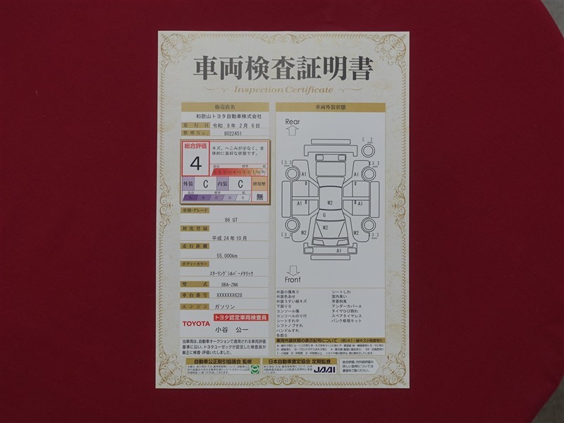 詳細及び現状の車両状態につきましては、店舗スタッフまでお尋ねください。 - 注2)上記と同様の評価点・状態表を「車両検査証明書」として店舗の展示車両に搭載しております。