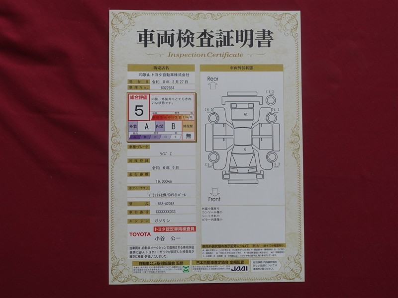 詳細及び現状の車両状態につきましては、店舗スタッフまでお尋ねください。 - 注2)上記と同様の評価点・状態表を「車両検査証明書」として店舗の展示車両に搭載しております。