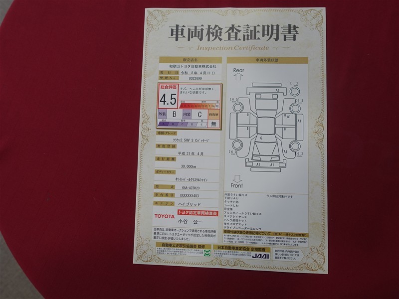上記と同様の評価点・状態表を「車両検査証明書」として店舗の展示車両に搭載しております。