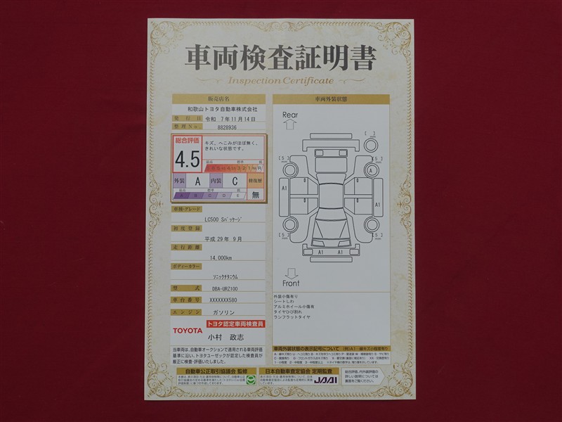 詳細及び現状の車両状態につきましては、店舗スタッフまでお尋ねください。 - 注2)上記と同様の評価点・状態表を「車両検査証明書」として店舗の展示車両に搭載しております。