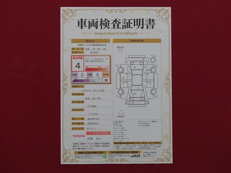 詳細及び現状の車両状態につきましては、店舗スタッフまでお尋ねください。 - 注2)上記と同様の評価点・状態表を「車両検査証明書」として店舗の展示車両に搭載しております。
