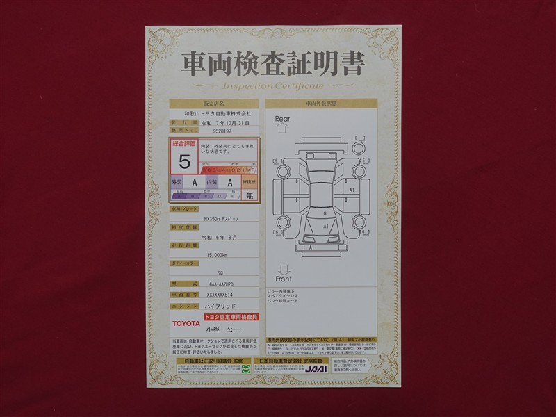 詳細及び現状の車両状態につきましては、店舗スタッフまでお尋ねください。 - 注2)上記と同様の評価点・状態表を「車両検査証明書」として店舗の展示車両に搭載しております。
