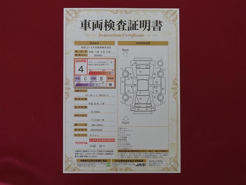 詳細及び現状の車両状態につきましては、店舗スタッフまでお尋ねください。 - 注2)上記と同様の評価点・状態表を「車両検査証明書」として店舗の展示車両に搭載しております。