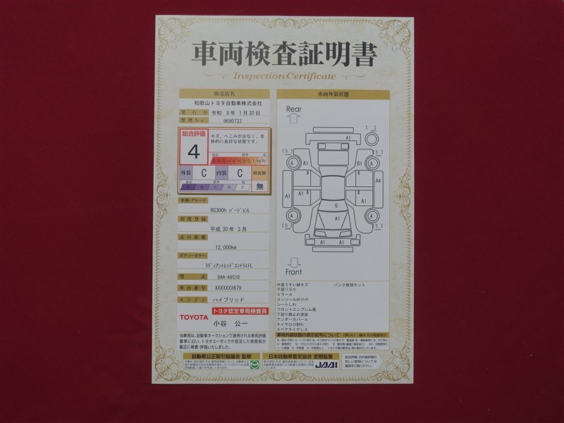 詳細及び現状の車両状態につきましては、店舗スタッフまでお尋ねください。 - 注2)上記と同様の評価点・状態表を「車両検査証明書」として店舗の展示車両に搭載しております。