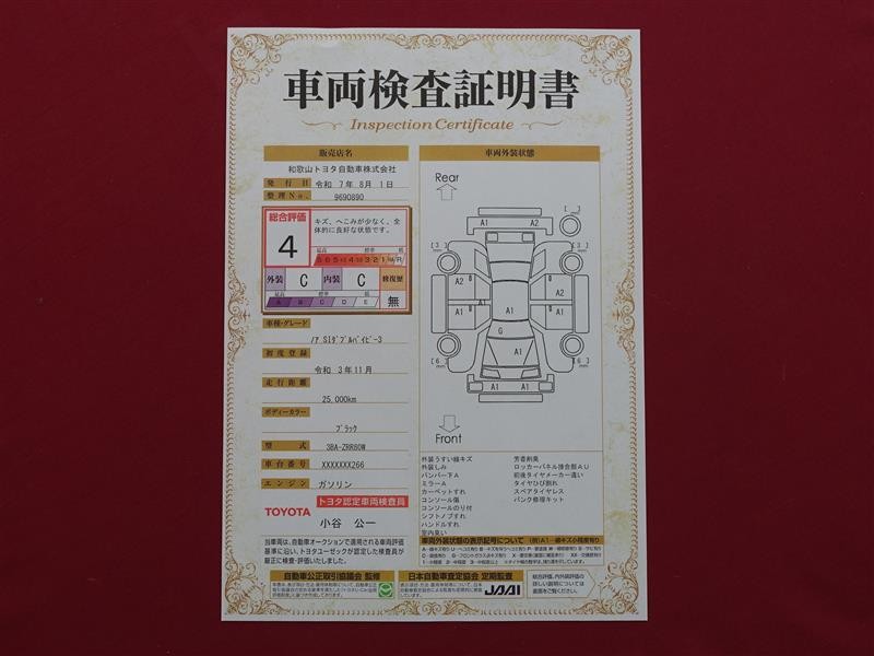 詳細及び現状の車両状態につきましては、店舗スタッフまでお尋ねください。 - 注2)上記と同様の評価点・状態表を「車両検査証明書」として店舗の展示車両に搭載しております。