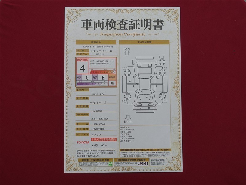詳細及び現状の車両状態につきましては、店舗スタッフまでお尋ねください。 - 注2)上記と同様の評価点・状態表を「車両検査証明書」として店舗の展示車両に搭載しております。