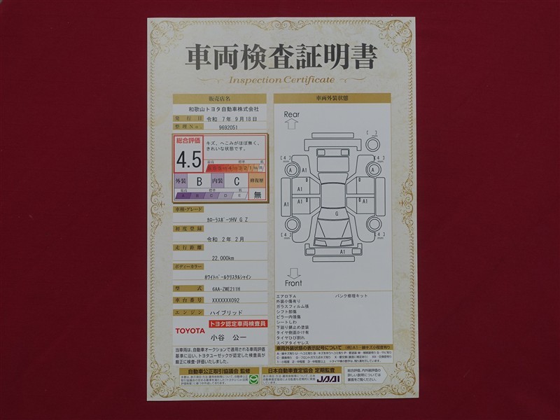 詳細及び現状の車両状態につきましては、店舗スタッフまでお尋ねください。 - 注2)上記と同様の評価点・状態表を「車両検査証明書」として店舗の展示車両に搭載しております。