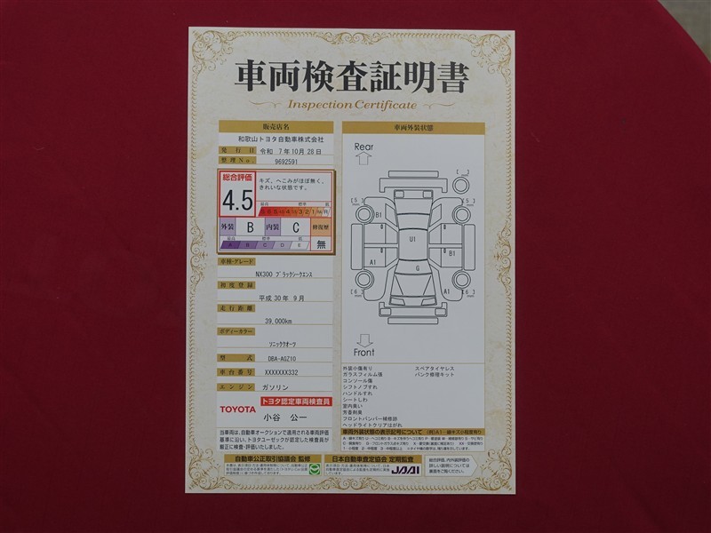 詳細及び現状の車両状態につきましては、店舗スタッフまでお尋ねください。 - 注2)上記と同様の評価点・状態表を「車両検査証明書」として店舗の展示車両に搭載しております。