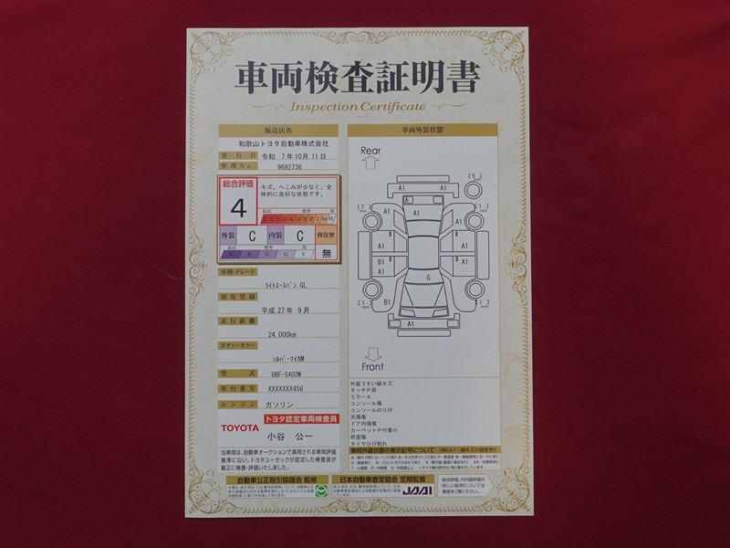 詳細及び現状の車両状態につきましては、店舗スタッフまでお尋ねください。 - 注2)上記と同様の評価点・状態表を「車両検査証明書」として店舗の展示車両に搭載しております。