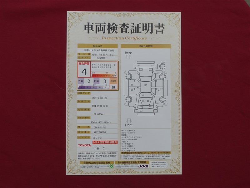 詳細及び現状の車両状態につきましては、店舗スタッフまでお尋ねください。 - 注2)上記と同様の評価点・状態表を「車両検査証明書」として店舗の展示車両に搭載しております。