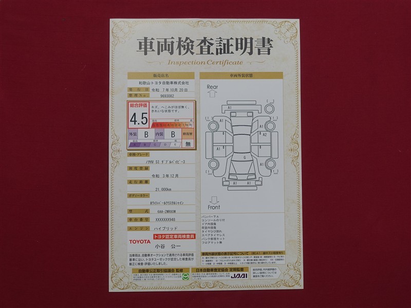 詳細及び現状の車両状態につきましては、店舗スタッフまでお尋ねください。 - 注2)上記と同様の評価点・状態表を「車両検査証明書」として店舗の展示車両に搭載しております。