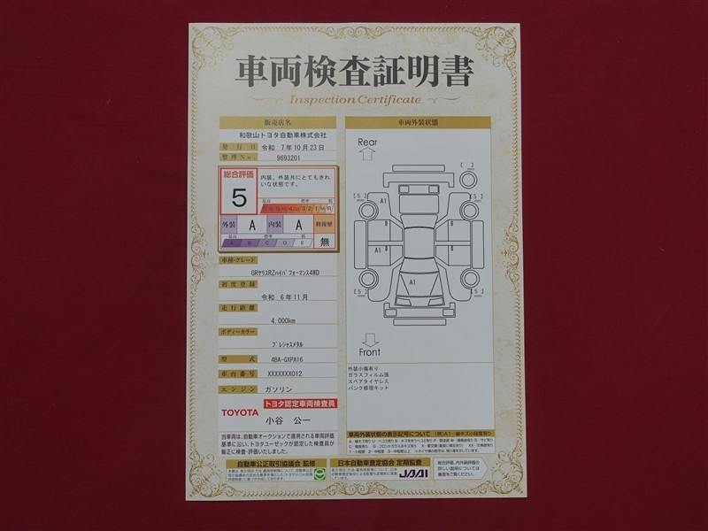 詳細及び現状の車両状態につきましては、店舗スタッフまでお尋ねください。 - 注2)上記と同様の評価点・状態表を「車両検査証明書」として店舗の展示車両に搭載しております。