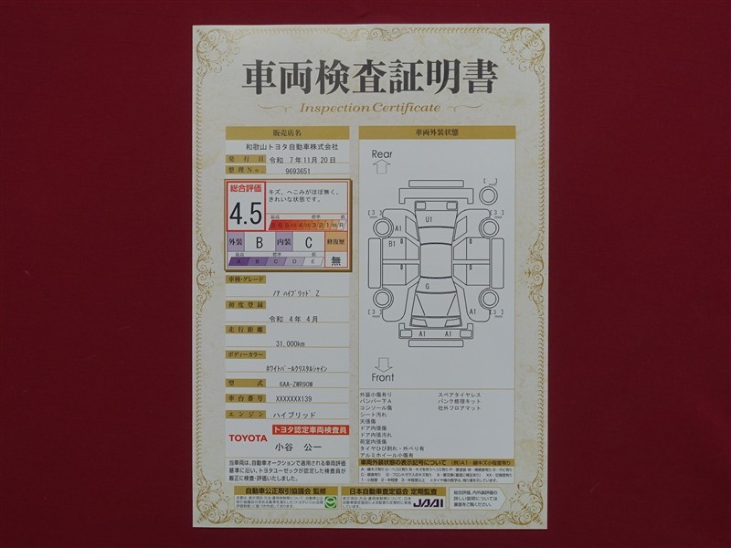 詳細及び現状の車両状態につきましては、店舗スタッフまでお尋ねください。 - 注2)上記と同様の評価点・状態表を「車両検査証明書」として店舗の展示車両に搭載しております。