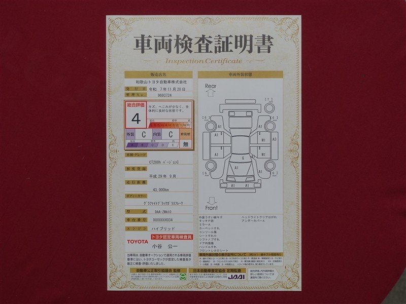 詳細及び現状の車両状態につきましては、店舗スタッフまでお尋ねください。 - 注2)上記と同様の評価点・状態表を「車両検査証明書」として店舗の展示車両に搭載しております。