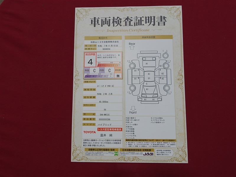 詳細及び現状の車両状態につきましては、店舗スタッフまでお尋ねください。 - 注2)上記と同様の評価点・状態表を「車両検査証明書」として店舗の展示車両に搭載しております。