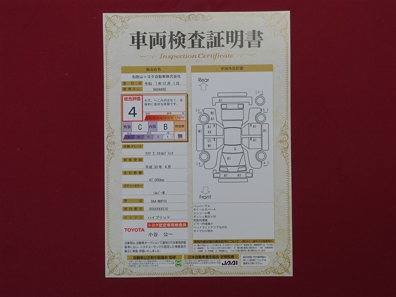 詳細及び現状の車両状態につきましては、店舗スタッフまでお尋ねください。 - 注2)上記と同様の評価点・状態表を「車両検査証明書」として店舗の展示車両に搭載しております。