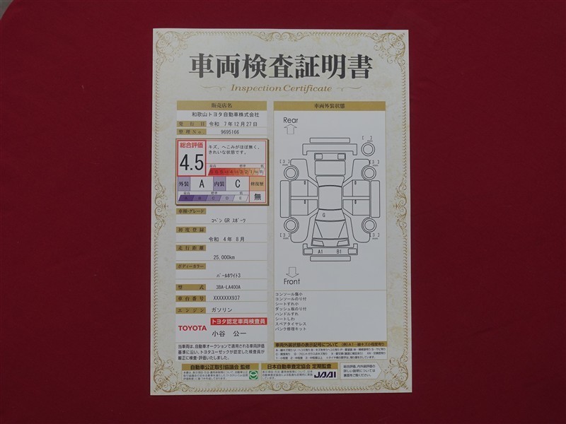 詳細及び現状の車両状態につきましては、店舗スタッフまでお尋ねください。 - 注2)上記と同様の評価点・状態表を「車両検査証明書」として店舗の展示車両に搭載しております。
