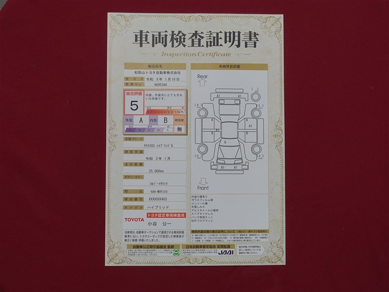 詳細及び現状の車両状態につきましては、店舗スタッフまでお尋ねください。 - 注2)上記と同様の評価点・状態表を「車両検査証明書」として店舗の展示車両に搭載しております。