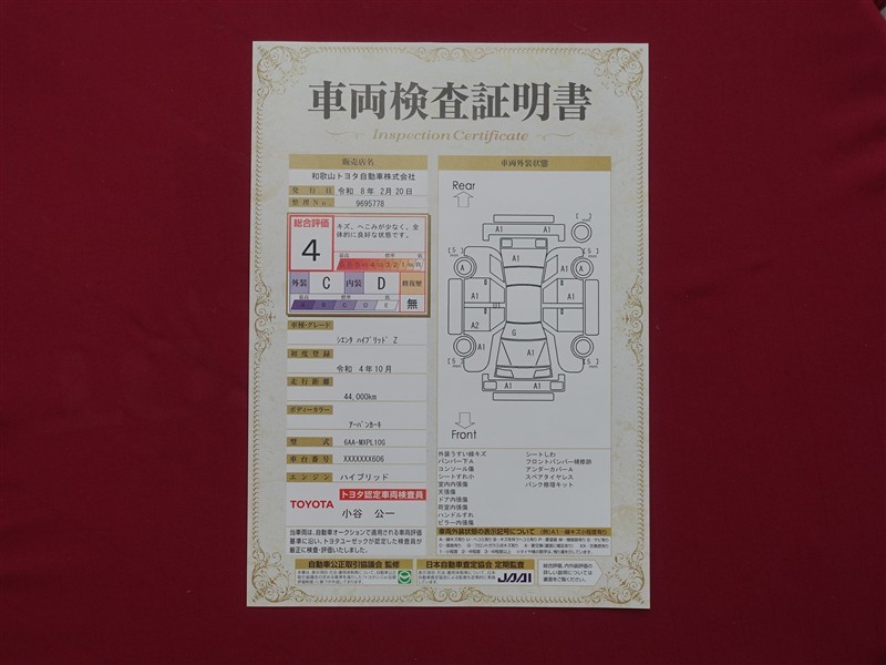 詳細及び現状の車両状態につきましては、店舗スタッフまでお尋ねください。 - 注2)上記と同様の評価点・状態表を「車両検査証明書」として店舗の展示車両に搭載しております。