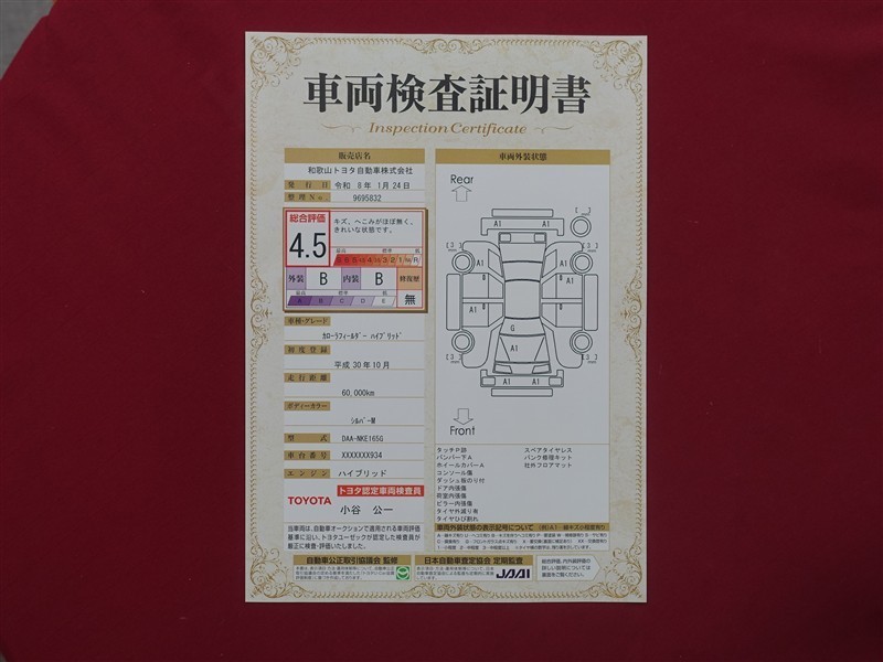 詳細及び現状の車両状態につきましては、店舗スタッフまでお尋ねください。 - 注2)上記と同様の評価点・状態表を「車両検査証明書」として店舗の展示車両に搭載しております。