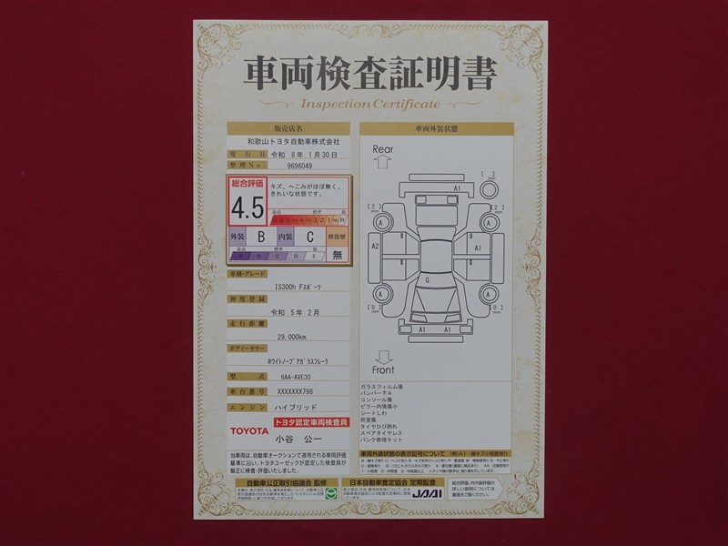 詳細及び現状の車両状態につきましては、店舗スタッフまでお尋ねください。 - 注2)上記と同様の評価点・状態表を「車両検査証明書」として店舗の展示車両に搭載しております。