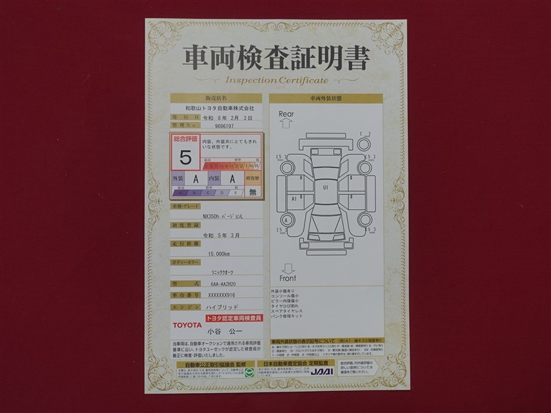 詳細及び現状の車両状態につきましては、店舗スタッフまでお尋ねください。 - 注2)上記と同様の評価点・状態表を「車両検査証明書」として店舗の展示車両に搭載しております。