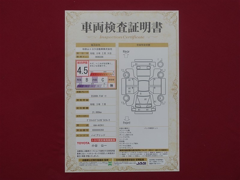 詳細及び現状の車両状態につきましては、店舗スタッフまでお尋ねください。 - 注2)上記と同様の評価点・状態表を「車両検査証明書」として店舗の展示車両に搭載しております。