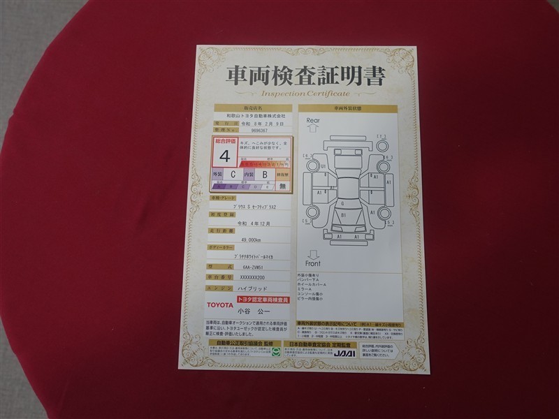 詳細及び現状の車両状態につきましては、店舗スタッフまでお尋ねください。 - 注2)上記と同様の評価点・状態表を「車両検査証明書」として店舗の展示車両に搭載しております。