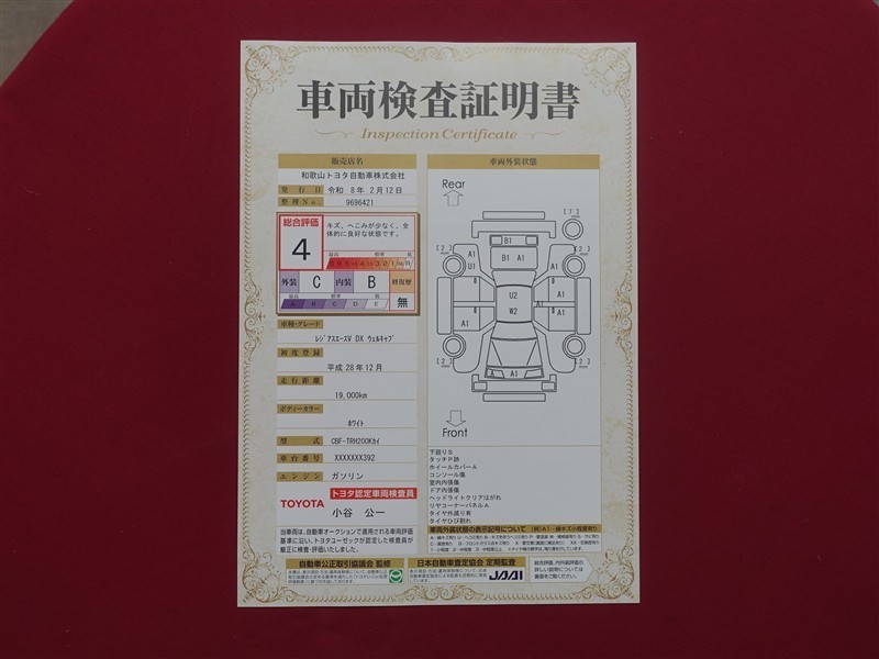 詳細及び現状の車両状態につきましては、店舗スタッフまでお尋ねください。 - 注2)上記と同様の評価点・状態表を「車両検査証明書」として店舗の展示車両に搭載しております。