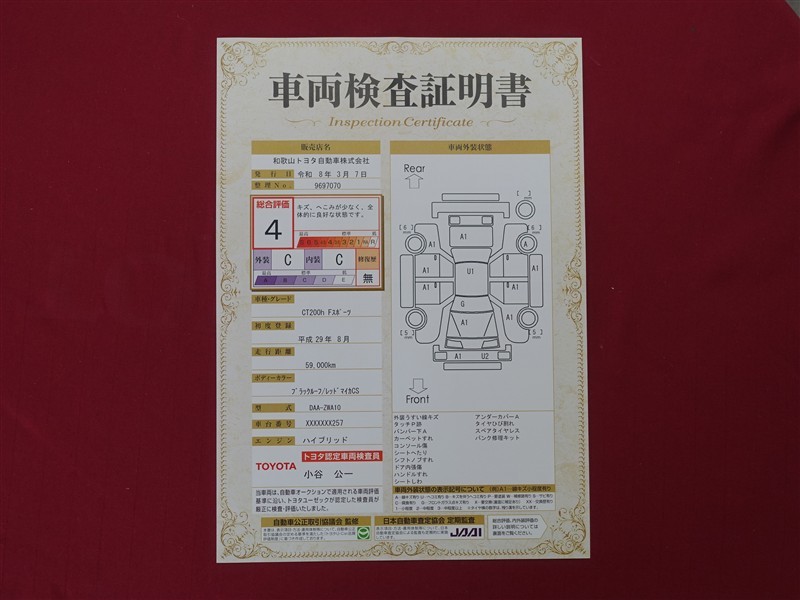 詳細及び現状の車両状態につきましては、店舗スタッフまでお尋ねください。 - 注2)上記と同様の評価点・状態表を「車両検査証明書」として店舗の展示車両に搭載しております。