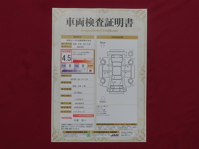 - 表示項目・方法・運用体制等について、自動車公正取引協議会の定める基準を満たした「トヨタU-Car品質評価制度」に基づき作成しております。