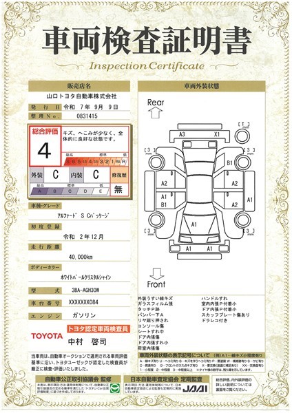 詳細及び現状の車両状態につきましては、店舗スタッフまでお尋ねください。 - 注2)上記と同様の評価点・状態表を「車両検査証明書」として店舗の展示車両に搭載しております。