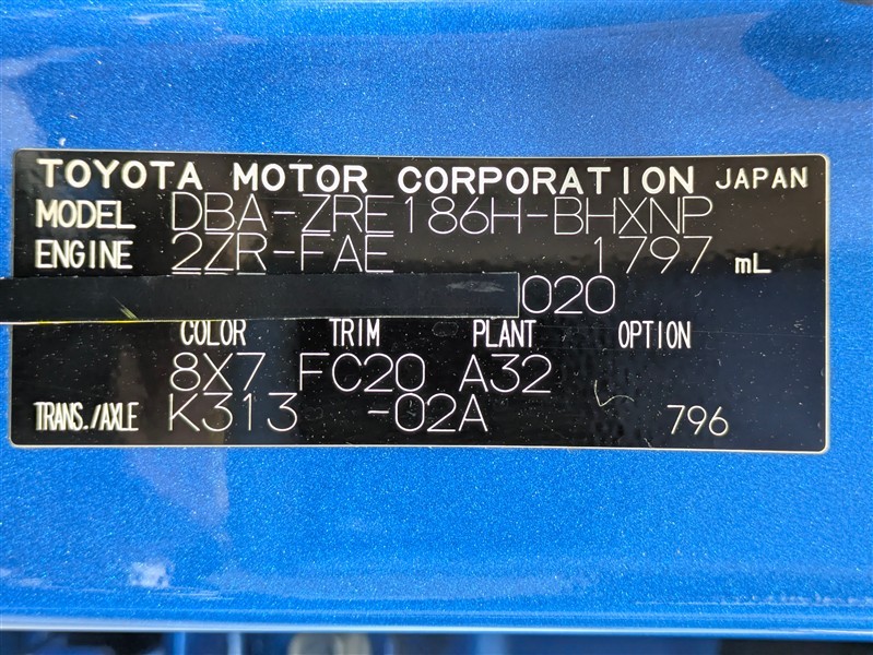 店舗管理ナンバー【072019508242】車台番号(下3桁)【020】