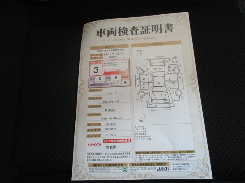 詳細及び現状の車両状態につきましては、店舗スタッフまでお尋ねください。 - 注2)上記と同様の評価点・状態表を「車両検査証明書」として店舗の展示車両に搭載しております。