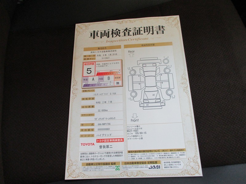 詳細及び現状の車両状態につきましては、店舗スタッフまでお尋ねください。 - 注2)上記と同様の評価点・状態表を「車両検査証明書」として店舗の展示車両に搭載しております。