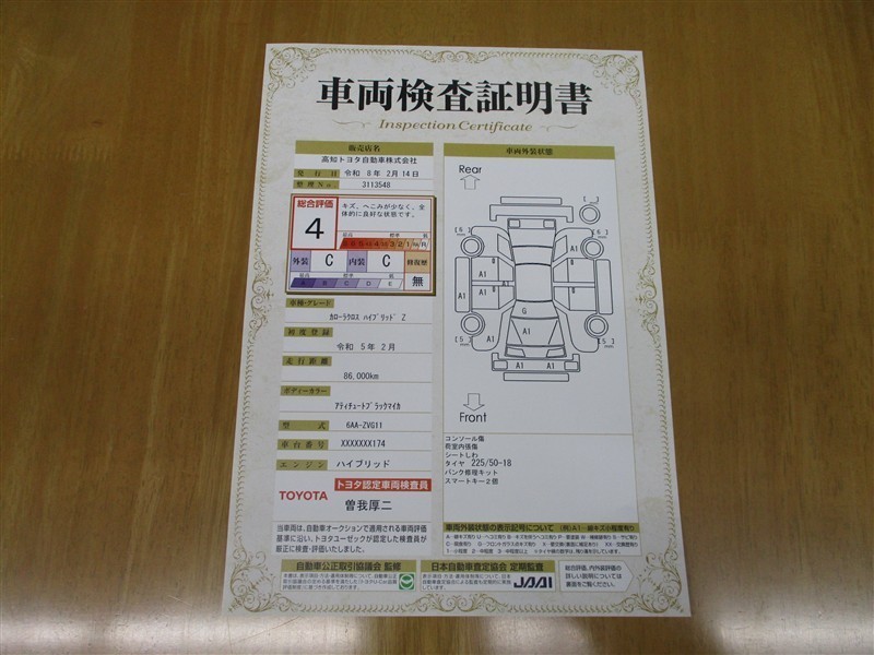 上記と同様の評価点・状態表を「車両検査証明書」として店舗の展示車両に搭載しております。