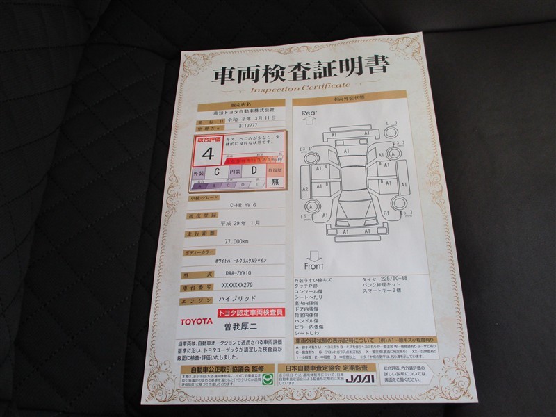詳細及び現状の車両状態につきましては、店舗スタッフまでお尋ねください。 - 注2)上記と同様の評価点・状態表を「車両検査証明書」として店舗の展示車両に搭載しております。