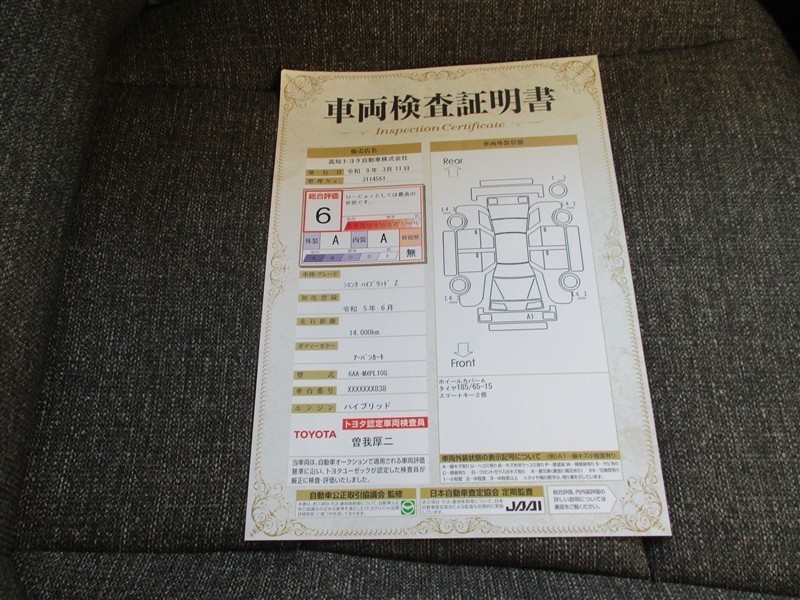 上記と同様の評価点・状態表を「車両検査証明書」として店舗の展示車両に搭載しております。