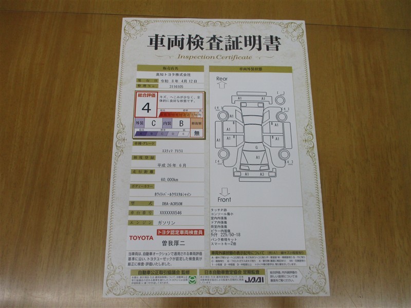 詳細及び現状の車両状態につきましては、店舗スタッフまでお尋ねください。 - 注2)上記と同様の評価点・状態表を「車両検査証明書」として店舗の展示車両に搭載しております。