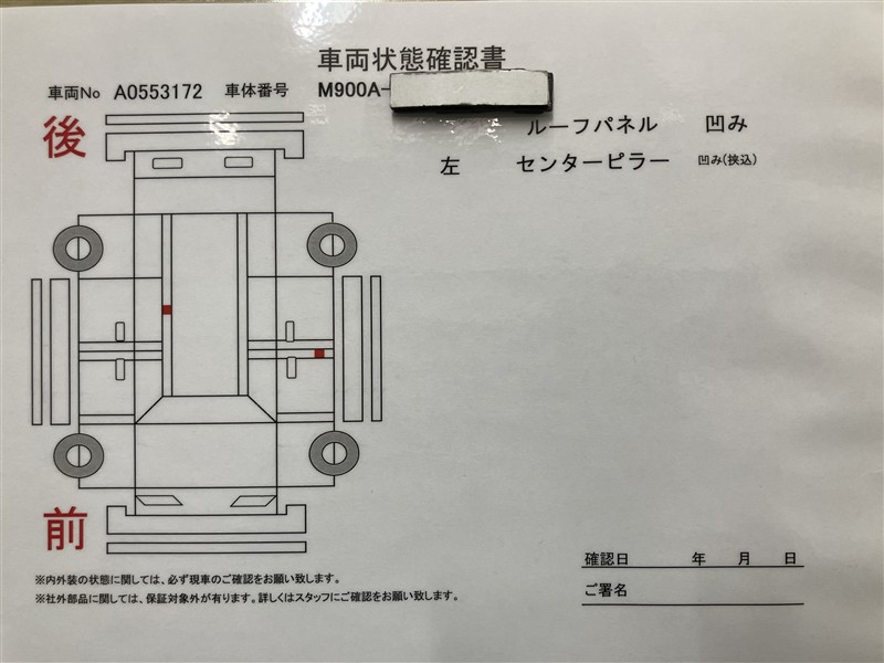 詳細及び現状の車両状態につきましては、店舗スタッフまでお尋ねください。 - 注2)上記と同様の評価点・状態表を「車両検査証明書」として店舗の展示車両に搭載しております。