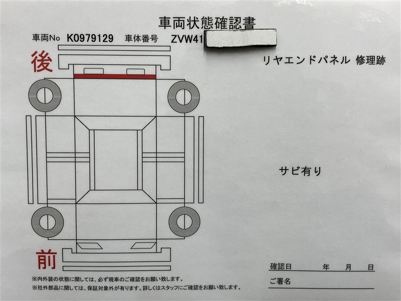 詳細及び現状の車両状態につきましては、店舗スタッフまでお尋ねください。 - 注2)上記と同様の評価点・状態表を「車両検査証明書」として店舗の展示車両に搭載しております。