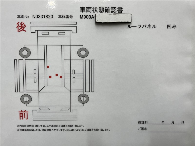 詳細及び現状の車両状態につきましては、店舗スタッフまでお尋ねください。 - 注2)上記と同様の評価点・状態表を「車両検査証明書」として店舗の展示車両に搭載しております。